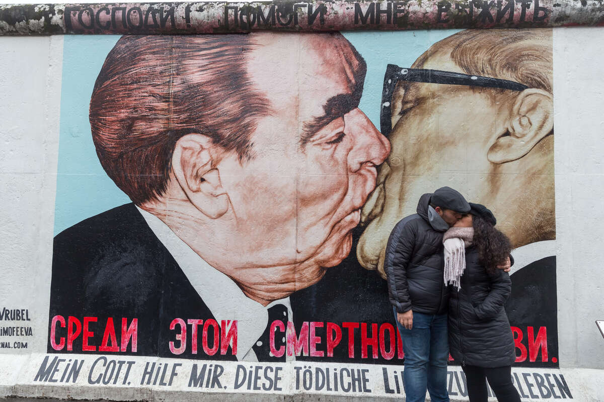 1961年柏林圍牆誕生,硬生生將柏林一分為二,直到1989年才倒榻,目前殘跡所剩無幾,只是後來許多藝術家在保留下來圍牆一部分創作,成了現今的藝廊,象徵著自由的紀念地,其中,以Dimitri Vrubel的「兄弟之吻」作品最為著名。
